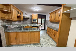 The separate, functional kitchen opens directly onto a covered, tiled terrace, ideal for outdoor dining while enjoying a sheltered space.